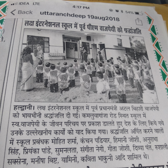 Laksh International School is a futuristic school which follows international norms, and is located at Haripur Nayak, Kamaluaganja Road, Haldwani. It was established in 2010 and is owned and run by 'Rampal Sharma Society'. Laksh International School is affiliated to Central Board of Secondary Education (CBSE), New Delhi, and is recognized by the Uttarakhand State Government.